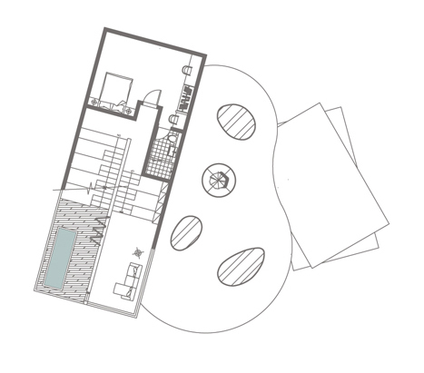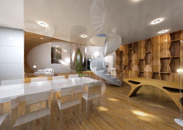 這雖然是一座用于休閑的家庭別墅,總共有3層,最高層在蠶繭的中央,分別是圓形的廚房和客廳。右面分布著臥室。3層與家庭房鏈接的是圖書室,溫暖的午后,坐在屋頂的花園,一杯咖啡,一本書,足以度過一個悠閑的下午。