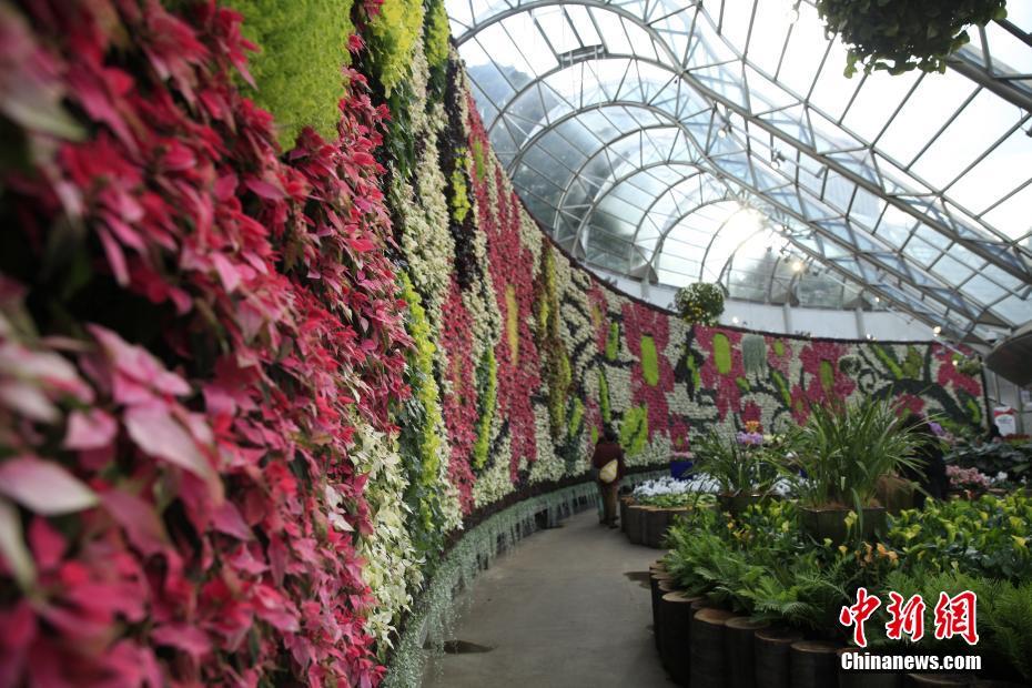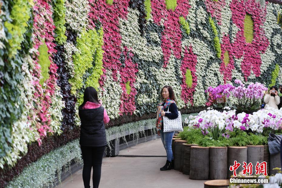 7月中旬,悉尼皇家植物園正在展出的TheCalyx花墻,由18090種植物組成,高6米、長50米,號稱南半球最大的室內花墻。圖為游人在花墻前留影。
