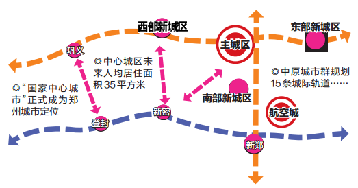 “多心”是指以二七廣場商業中心、鄭東新區CBD、鄭州東站交通樞紐中心、鄭州航空港交通樞紐中心為核心,構建區域——城市——片區三個層次的城市中心體系。