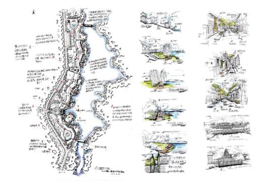 對于文化旅游小的業態屬性來說,今后的運營模式是另一個決定成敗的關鍵。因此,業態的設定,資源的利用,和步行街到的體驗感也影響著小鎮空間構架的確定。經過和業主的多次溝通之后,笛東成都團隊的設計師大膽地將原有的“一”字形單條街道的規劃形式,調整為“S”形縱向三街十多條橫向巷道的布局方式,更大限度地利用了現狀地形和自然風光。每條街的屬性完全不同,并通過橫向的臺階巷道將其串聯,使游客可以任意地穿梭于繁華的主街,風情的酒吧街,和生態的濱湖步道之間,為游客提供多元化的商業形態,最大限度地增加了古鎮街區的體驗感和可逛性。