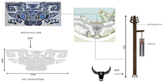 其中,牛頭,圖騰柱,蠟染紋樣等最具有當地苗族風情的符號標志在笛東的設計中得到充分的運用。另外四個主要節點廣場的定位,也源于笛東對苗族文化的研究。“尤公”“苗斗”“鼓樓”“錦雞”代表了苗族文化中幾個最為重要的習俗和禮儀,傳遞了苗族人民自古以來的傳統信仰和圖騰崇拜,以及苗歷中的重要日期的祭祀和慶典儀式的還原與保護,也在這四個最為主要的廣場中得以體現。
