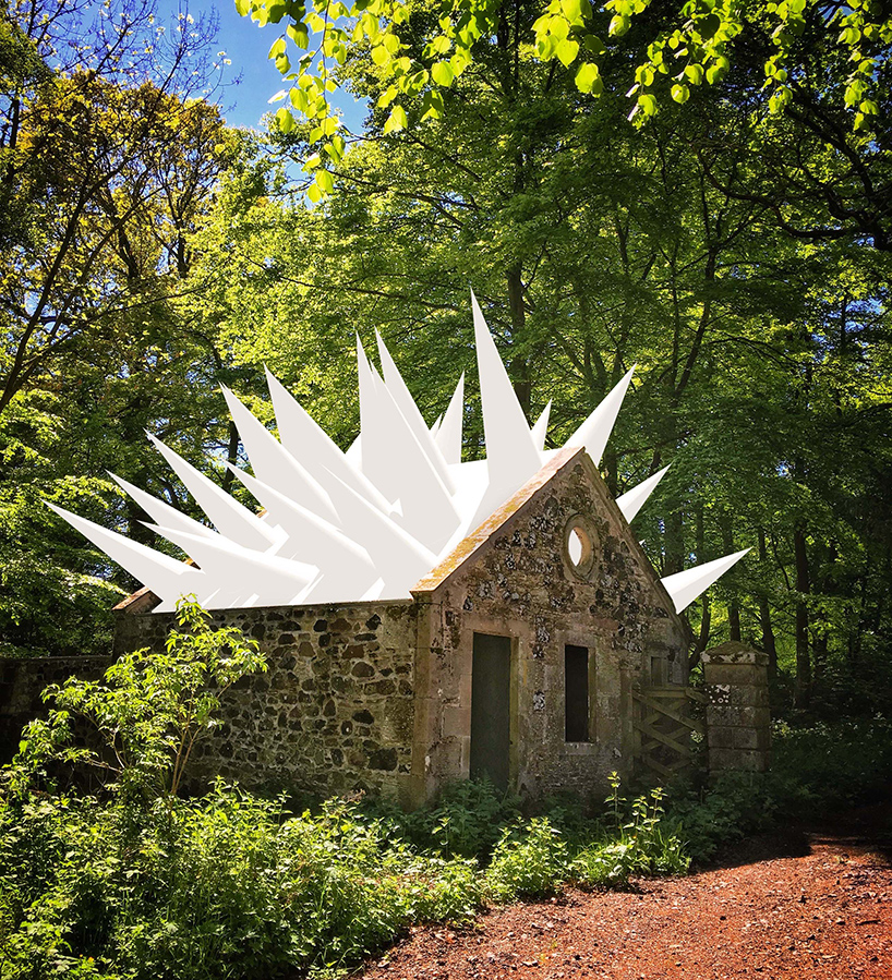 作品scattered是一系列巨大的球體,它們就像是不透明的氣泡一樣漂浮在湖面上,成為mellerstain最著名、最讓人印象深刻的景觀之一。這些球體的直徑達到4米,它們打破了湖面原有的平靜,它們的大小、表面和顏色都讓人印象深刻。作品pointed位于一棟長期沒有斜屋面的房子里,它從屋面輪廓里伸了出來,28個長長的尖角伸向空中,每一個長度都超過了3米,整體看上去就像是星爆的樣子,又像是程式化爆炸過程中的一個瞬時狀態。最后,作品towered是一系列8米多高的圓柱體,外形的靈感來自于一座舊洗衣房廢墟的弧形墻面。
