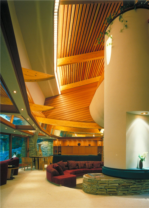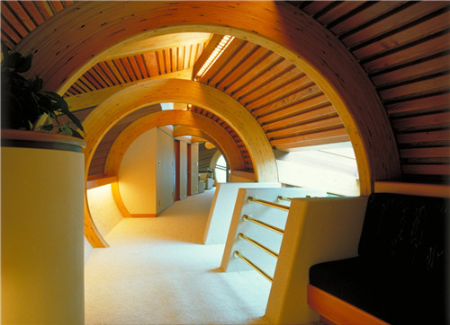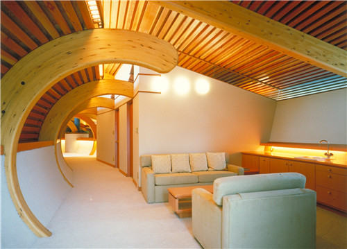 帶廣地區容易發生地震。為了幫助抗震,膠合層壓梁設計成彎曲的元件,這也使得天花板、墻壁和地板之間的界限變得模糊。