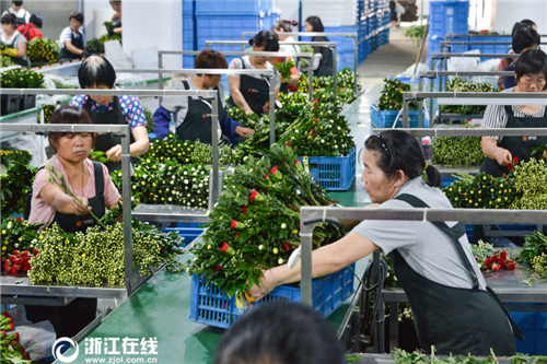 紹興市柯橋區平水鎮海豐花卉種植加工出口基地,宛如一個超級農貿市場,200多名工人正在有條不紊地進行選花、切葉、打把、分選、養水,流水線作業包裝出口日本的新鮮菊花。