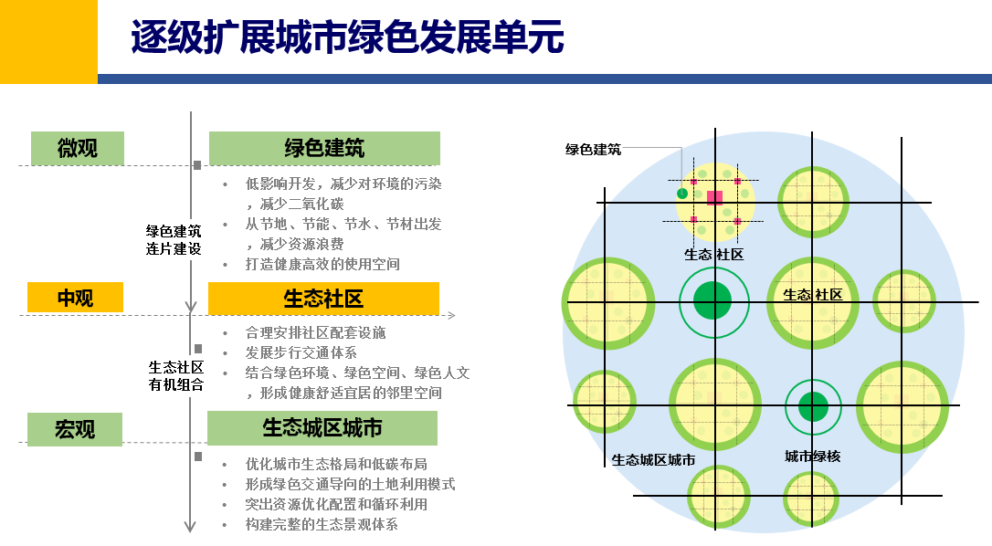我們要構筑一系列的綠色城市細胞單元,從綠色建筑、綠色生態社區,一直到綠色的生態城區和城市,構筑一個綠色發展的細胞單元,因為它是一個生命有機體。