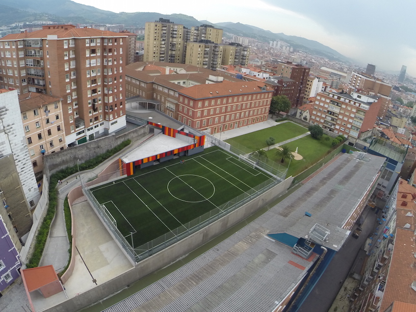 廢棄大多學校都采用的水泥墻,foraster arquitectos設計事務所在這個十九世紀主樓旁邊構畫出一個新的門廊。墻面采用紅色、棕色和藍色條紋,利用圓形的結構建造出一個回廊。它的屋頂也是一個值得稱道的設計,可以在上面走,并作為觀看比賽的平臺。設計團隊還將硬地板用人工草皮替代,更加易于維護。共享學校空間的宗教社團對這個改造工程也很滿意,雖然減少了他們私人花園的面積,但是在如此緊張預算的情況下,打造出這樣的綠色空間,實屬不易。