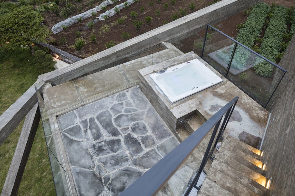 建筑師推測和想象了委托人的隱密的生活方式。因此地堡一樣的家插入到了土地里,中間有一個中庭形成了第一個平面。水平的縫隙像薩伏伊別墅(位于巴黎,現(xiàn)代主義建筑經(jīng)典作品之一)一樣將住房從中間分開,一半下沉,另一半漂浮。沉重物體的無法承受之輕是一個來自于反重力理念的想法。謙遜且低矮的曲線屋頂是對濟州傳統(tǒng)住宅的致敬。很多時候一個被贊許的方案也會因為業(yè)主想法的突然改變被迫換掉。這就是其中一個例子。