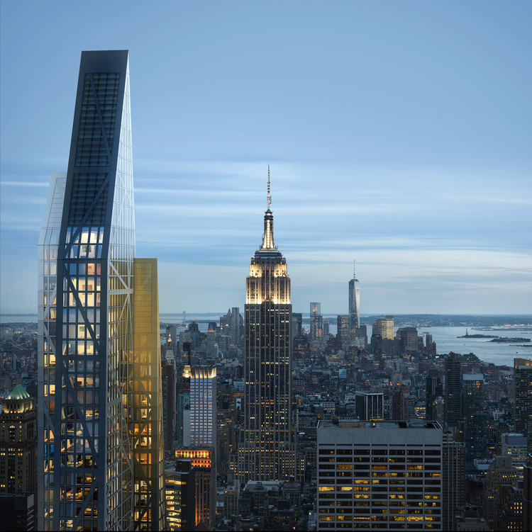 由普利茲克建筑獎獲得者讓·努維爾(Jean Nouvel)設(shè)計的 53W53 項目發(fā)布了最新的效果圖,預(yù)計明年將完成這座共82層樓的第58層建設(shè)。這幅效果圖反映了這座新坐標(biāo)的整體設(shè)計,讓我們看到了極具造型感的逐漸纖細(xì)的形態(tài),以及位于塔樓之下毗鄰現(xiàn)代藝術(shù)博物館(Museum of Modern Art)并作為其擴建部分的三層展廳。