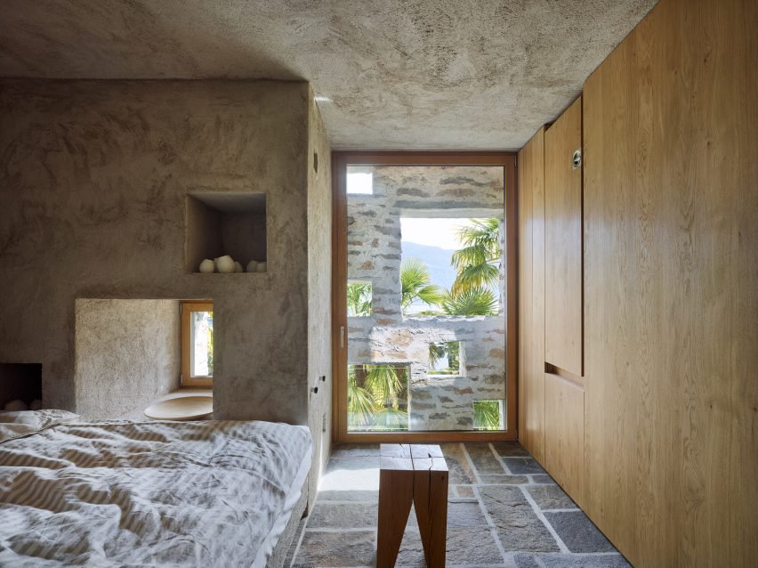 瑞士阿斯科納鎮的一幢傳統石頭房子,通過錯落有致的窗戶可欣賞花園和馬焦雷湖 (Lake Maggiore,位于意大利與瑞士交界)的美景。