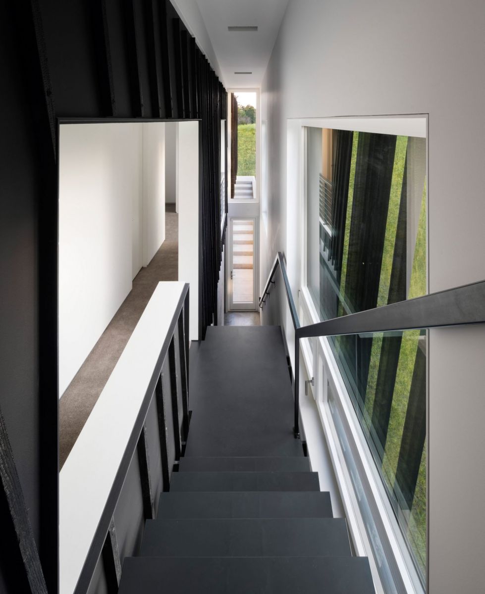 “不同厚度和深度的板子水平放置,使外立面具有深度,圖形和紋理視覺(jué)效果。房子長(zhǎng)邊一側(cè)連續(xù)不斷地以窗戶的方式架構(gòu),來(lái)加強(qiáng)純凈的視覺(jué)感受。而房子寬邊一側(cè)采用玻璃墻,以最大化景觀,兩部分都是如此。”
