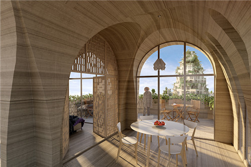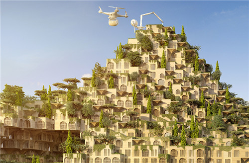 在這個(gè)堆積住房單元屋頂設(shè)有農(nóng)場和農(nóng)田,不僅保證了居民食物自給自足,而且還保證了建筑環(huán)境良好的熱慣性。
