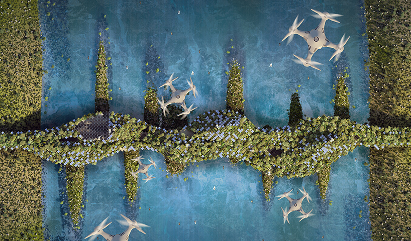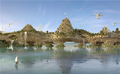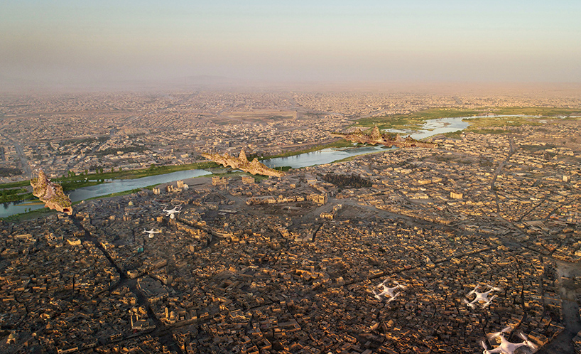 Vincent Callebaut 展示了他們的Rifat Chadirji獎(jiǎng)(注:以伊拉克最杰出建筑設(shè)計(jì)師之一名字命名的獎(jiǎng)項(xiàng))獲獎(jiǎng)項(xiàng)目“五架綠色橋梁”,該項(xiàng)目提出在單元房屋屋頂建造價(jià)格合理并且可適應(yīng)性強(qiáng)的橋梁。Rifat Chadirji大獎(jiǎng)的設(shè)立主旨是為了重建摩蘇爾(Mosul)伊拉克解放區(qū)集思廣益。在老城的廢墟中重建新的房屋模塊,為了解決房屋緊缺問題,Vincent Callebaut將使用利用戰(zhàn)爭碎片3D打印房屋模塊,可創(chuàng)造53,000個(gè)房屋。