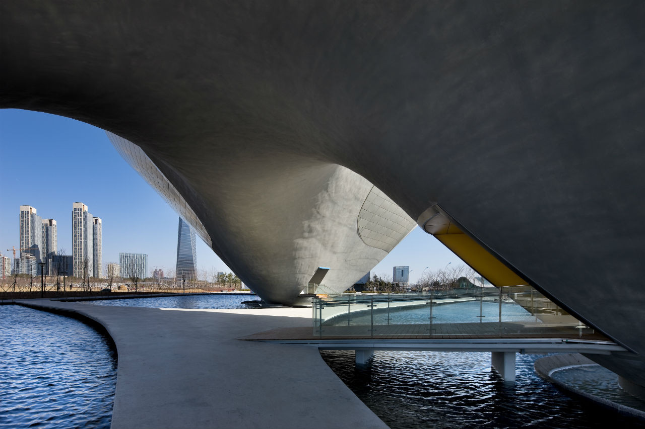 該項目的設計目標是在韓國仁川港的Song Do中央公園建設一座標志性建筑以象征仁川港的形象,并提供展覽、表演和聚會的空間。建筑看上去像是三個連在一起的碗。弧形的墻體之上是平屋頂,頂層是一個寬闊的平臺。外墻體一部分是直接暴露的混凝土,一部分加覆了鋁塑板。