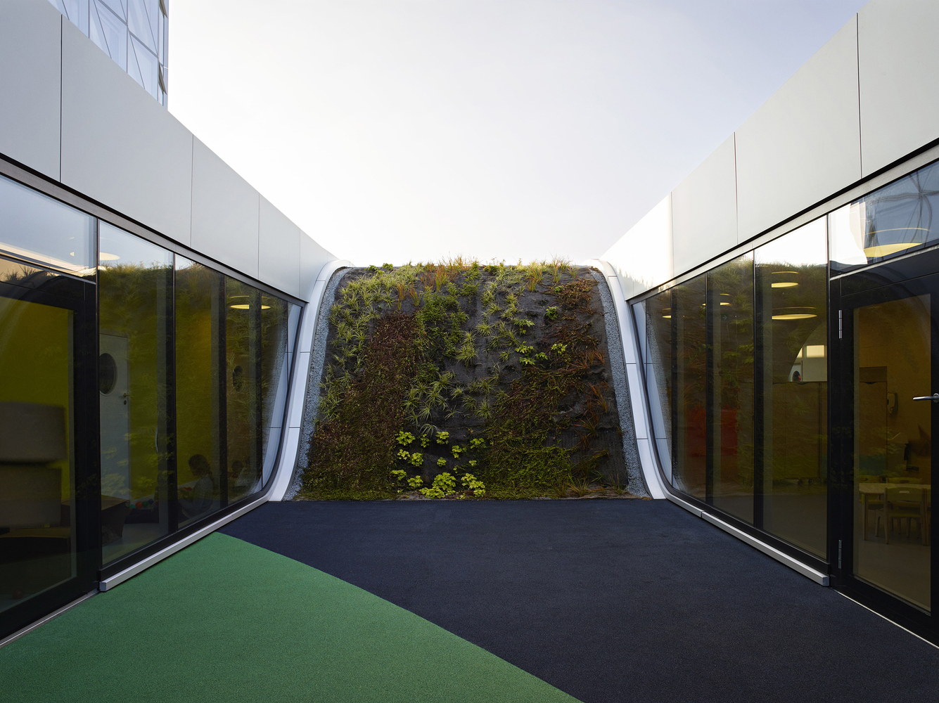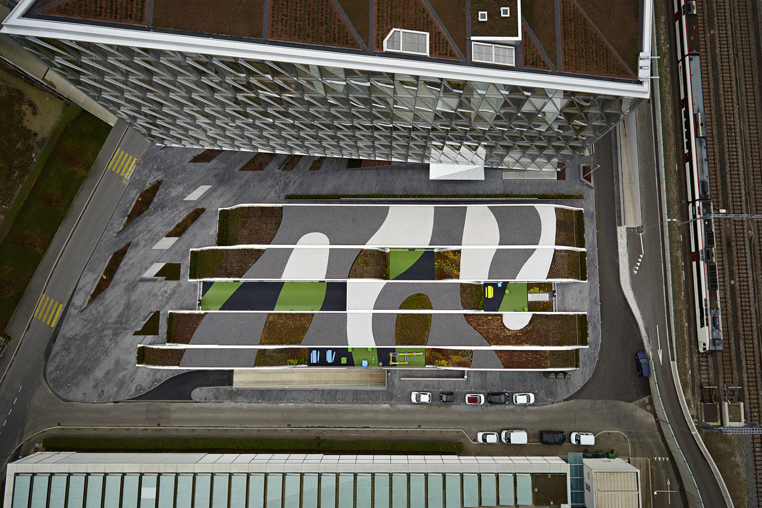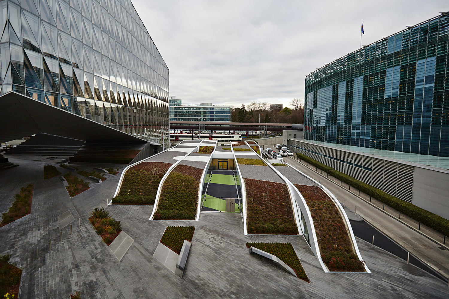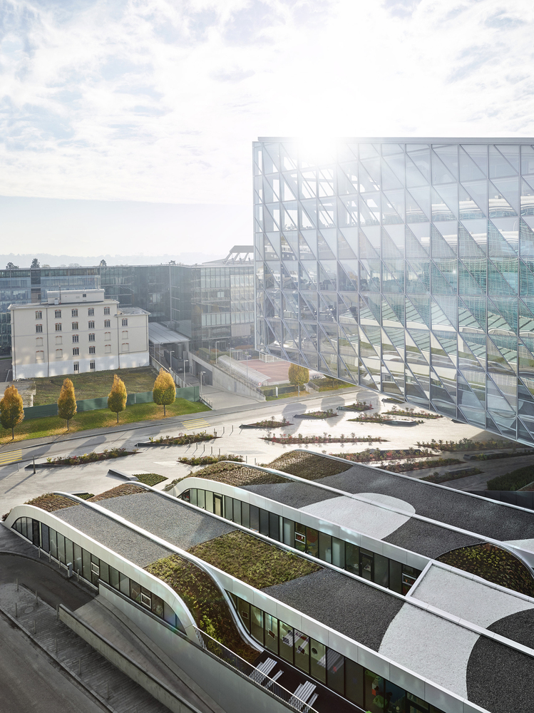 這片兒童區(qū)域與日本國(guó)際煙草公司日內(nèi)瓦分部相連。位于日本國(guó)際煙草公司與世界氣象組織這兩個(gè)大體量構(gòu)筑物之間的幼兒園,被定位為具有功能的景觀建筑。