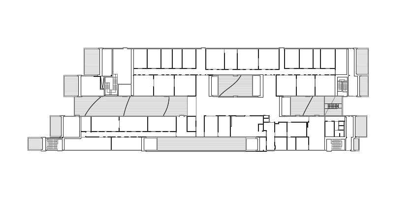 幼兒園的設(shè)計(jì)手法可稱(chēng)之為一種夸張的建筑景觀表達(dá)。人們能夠從被壓低的核心層來(lái)到基地的中心。進(jìn)入任意一個(gè)空間后,均能夠看到室外的活動(dòng)空地與其他功能房間的活躍狀態(tài)。