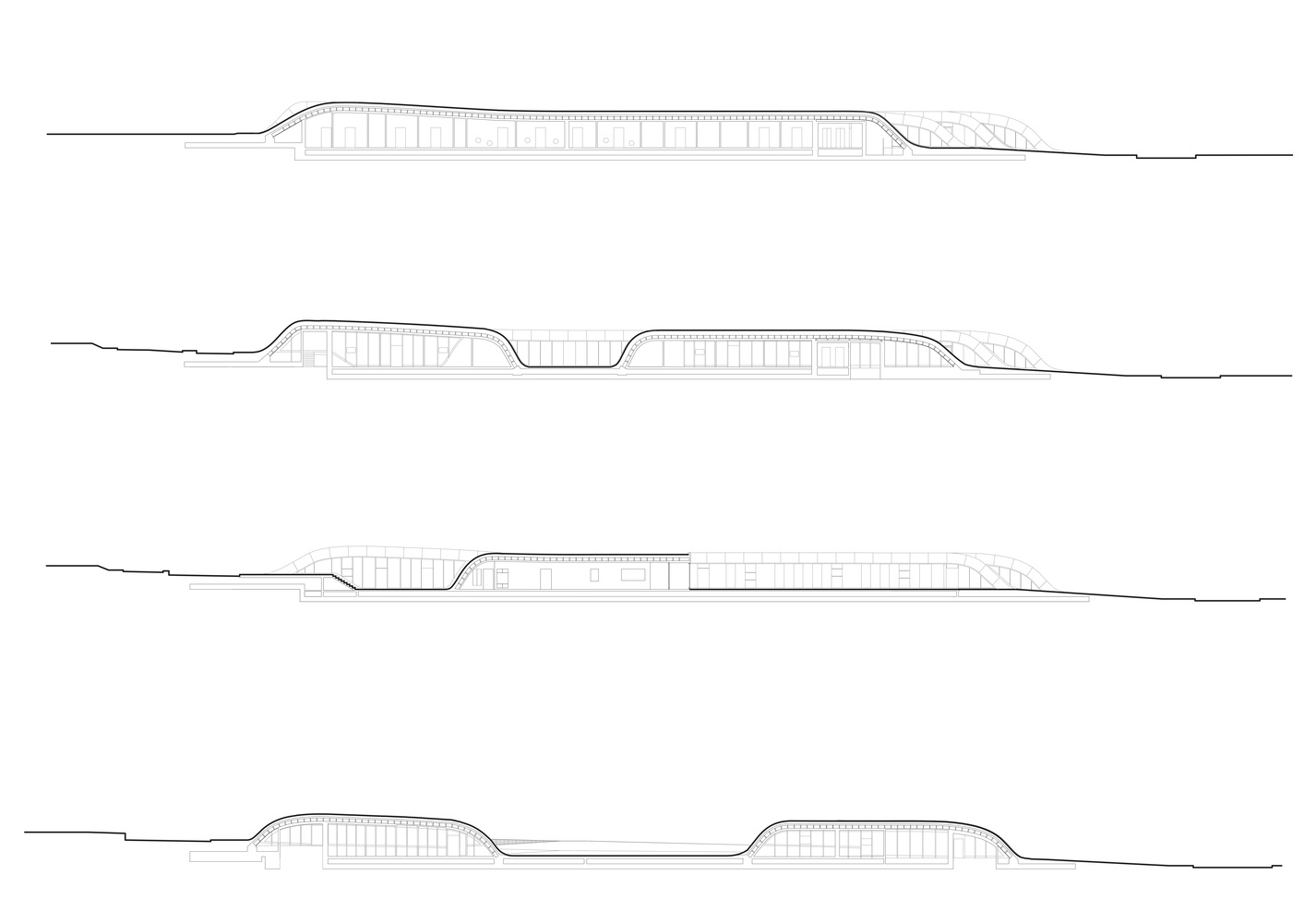 建筑所采用的常規(guī)結(jié)構(gòu)及其交替起伏的形態(tài)在基地滿鋪,屋面被植株所覆蓋。這種手法在起伏的凸起部分形成遮蔽空間,凹面下則為室內(nèi)活動(dòng)區(qū)域。折紙(Origami )幼兒園的特殊性質(zhì)源于這種重復(fù)的幾何規(guī)律形態(tài),設(shè)計(jì)師運(yùn)用了多種材料:金屬的窗戶豎框、橫梁與木材等。