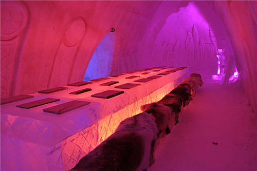 酒店內的床由冰制作而成。不過酒店也提供獨立的小木屋。酒店內有很多各種形象的冰雕,此外酒店還會舉辦各種冰雪活動。