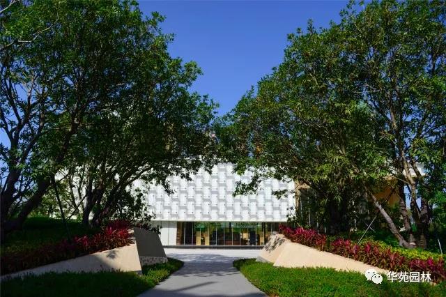 道路兩旁以精剪的新加坡龍船花打造流暢的地被線,桂花、樸樹等大喬構成上層骨架,加上樹姿優(yōu)美的紅花雞蛋花點睛,綠意盎然。售樓部前廣場入口采取夾景的手法,以底部鑲嵌著鏤空不銹鋼板的折形景墻與叢生楊梅相搭配,使人聚焦于售樓部,引人入勝。
