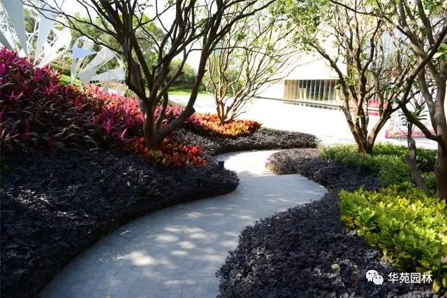 利用綠坡營造空間高差,搭配叢生水蒲桃、叢生和順樹等大喬,紅花繼木、泰國龍船花等花灌構成花境,加上雕塑的點綴,創(chuàng)造出絢麗多彩,疏密有致的綠化空間。由芝麻黑花崗巖鋪貼而成的弧形園路,線條流暢,嚴絲合縫。兩側的變?nèi)~木、灑金桃葉珊瑚等常綠灌木,與紅花繼木、巴西夜牡丹等花灌相互映襯,對植的叢生柚子增添秩序感,配合地形變化,營造出熱烈的景觀氛圍。