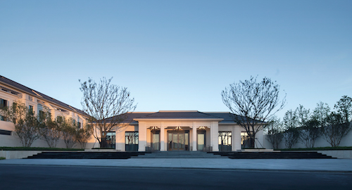 軸線對稱的序列,干凈大氣的鏡水面,顯示出入口的大氣與品質(zhì)。兩棵叢生樸樹仿佛兩個(gè)最忠誠的衛(wèi)士,守護(hù)這一片凈土與來往的客人。