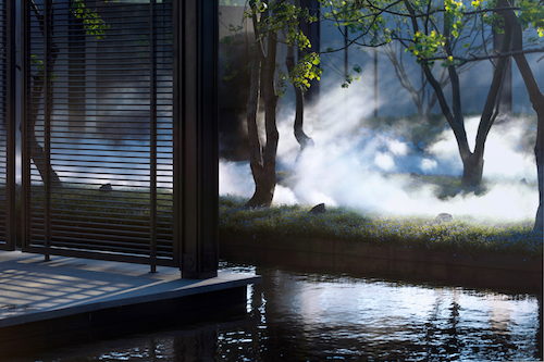干凈的空間結(jié)合霧森,營造了仙氣十足的水上森林氛圍。影在水中,風(fēng)襲來,宛如往事蕩漾在心間。
