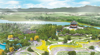 10月11日,記者在現(xiàn)場看到,園區(qū)最高的建筑——天田山頂?shù)挠缹庨w已經揭開了面紗,這是一處典型的中國傳統(tǒng)風格宮苑建筑,采用“高臺閣院”式布局,整體意象可以概括為:花田錯落,重臺參差,回廊環(huán)繞,高閣聳峙。