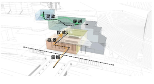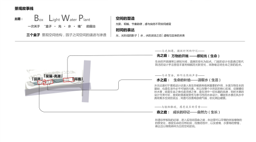 項(xiàng)目中還體現(xiàn)了消極空間向積極空間的轉(zhuǎn)化。由場(chǎng)地現(xiàn)狀離心型消極空間向向心型積極空間的轉(zhuǎn)化,設(shè)置停留點(diǎn)與流線(xiàn)串聯(lián)活動(dòng)場(chǎng)地。場(chǎng)地上由建筑自然劃分為三個(gè)景觀盒子,設(shè)計(jì)重點(diǎn)考慮為每個(gè)盒子賦予適合的場(chǎng)地屬性。