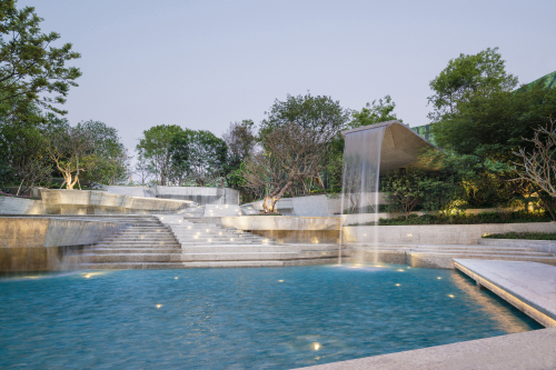 由廣州山水比德景觀設(shè)計(jì)有限公司孫虎主創(chuàng)設(shè)計(jì)的“廣州龍湖云峰原著”項(xiàng)目,設(shè)計(jì)團(tuán)隊(duì)運(yùn)用了兩軸三進(jìn)的空間理序。第一軸,尊貴之軸,都市軸線(xiàn)串聯(lián)“三進(jìn)”節(jié)點(diǎn)(主入口、門(mén)樓、售樓處入口),三重門(mén)禮,層層遞進(jìn),塑造歸家的尊貴感和儀式感;第二軸,自然之軸,延續(xù)大區(qū)景觀山水軸線(xiàn),用藝術(shù)化的手法塑造場(chǎng)地高差,突出場(chǎng)地得天獨(dú)厚的山地資源優(yōu)勢(shì)。