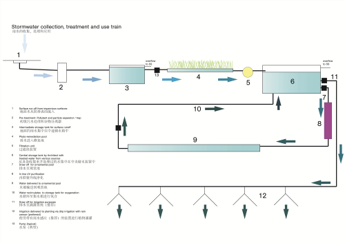 場地的總體設計充分考慮 LEED 金獎認證體系的要求,通過對水的高效利用、降低鋪裝表面面積、增加綠色覆蓋比率等措施來緩解城市熱島效應;充分考慮每個社區的微氣候,對冬季西北風設置屏障,促進夏季東南風的流通;在區域南側設置大型水景,起到降溫效果。