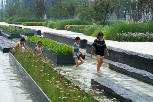 中央公園是一塊開放空間,有“公共綠地”和 “下沉花園”。“陽光之角”花園構成下沉草坪區的邊界,種植池被抬高,里面種植低矮的綠籬植物、裝飾性草坪和多年生草本植物。邊緣可供人們坐臥休息或者沐浴陽光、欣賞美景。休閑椅的位置經過精心的設計,并充分利用花園中的陽光直射點。中央公園的另一個主要特征是水景。美麗的水景可供當地居民娛樂休閑,同時在南側私人住宅區和北側公共開放空間之間起到隔離作用。