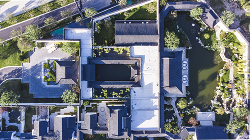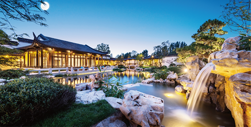 項目示范區參考傳統蘇式園林的傳統技法,應用于擋墻、太湖石假山及水系、卵石花街、植物配置等方面。將北方高山的氣概與江南園林的細膩溫婉相融合,呈南園北漸之勢,更顯隱逸和諧。