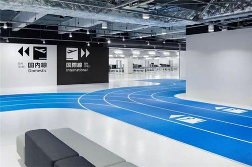 身為2020奧運(yùn)主辦國家,在成田國際機(jī)場T3航站樓的整體設(shè)計(jì)中可以看見許多關(guān)于體育的設(shè)計(jì)元素。整個(gè)航站樓的地板被“室內(nèi)跑道”元素圍繞,將運(yùn)動(dòng)跑道與機(jī)場跑道概念結(jié)合在一起。其中,藍(lán)色表示離開航空港,紅色則表示進(jìn)入航空港。