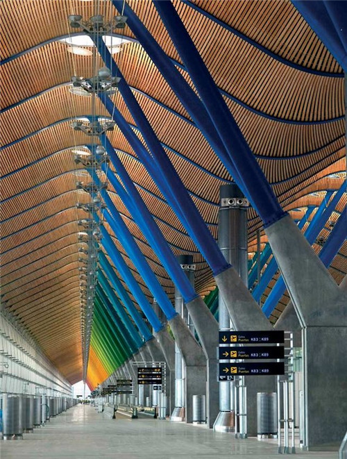 馬德里巴拉哈斯機(jī)場的T4航站樓是由知名建筑師安東尼奧·拉梅拉和理查德·羅杰斯設(shè)計(jì)的,以獨(dú)特的建筑空間、濃烈繽紛的色彩在旅客心中留下深刻的印象。這個(gè)全世界現(xiàn)代機(jī)場中最美麗的航站樓之一,在2006年榮獲英國皇家建筑師協(xié)會(huì)所頒發(fā)的RIBA Striling Prize的殊榮。