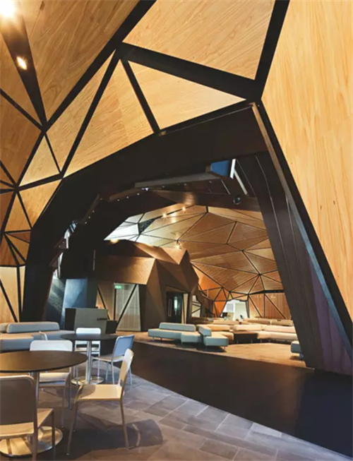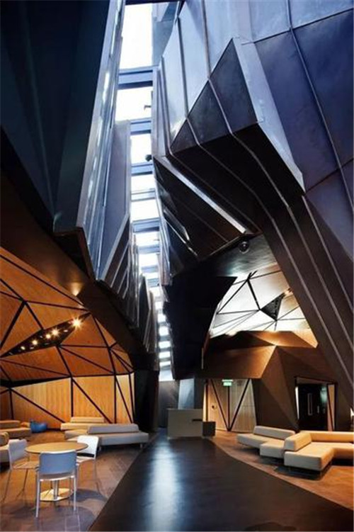 大樓設(shè)計(jì)獨(dú)特且極具創(chuàng)意,它模擬的是惠靈頓崎嶇的南海岸巖石,設(shè)計(jì)靈感來自關(guān)于海洋怪獸的古老毛利傳說。整個(gè)建筑從外面看來是一個(gè)完整的整體,進(jìn)入內(nèi)部能清晰地看到是兩個(gè)單體建筑。兩個(gè)單體之間的縫隙——被設(shè)計(jì)師稱之為“峽谷”,是這個(gè)建筑中最具戲劇性的設(shè)計(jì)。白天溫暖的自然光線透過這個(gè)“峽谷”上的縫隙——玻璃窗進(jìn)入室內(nèi);到了夜晚,室內(nèi)的光線又從裂隙中射向天空。