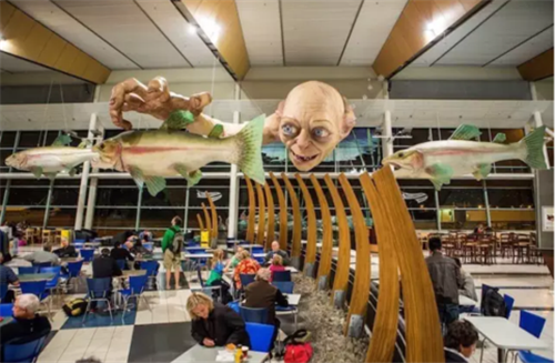 抵達(dá)惠靈頓機(jī)場航站樓的旅客們可能會(huì)倍感驚喜,因?yàn)樵谶@里,他們將會(huì)看到一個(gè)13米長的咕嚕姆雕塑。這一大型雕塑懸掛于天花板,體型依舊消瘦,但臉上閃過一陣狂喜,他潛入水底,伸手捕捉他最鐘愛的美食——"鮮美多汁的肥魚"。除了巨大的咕嚕姆雕像,惠靈頓機(jī)場的傳送帶也已經(jīng)變身為中土世界的霍比特人小屋。