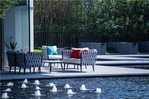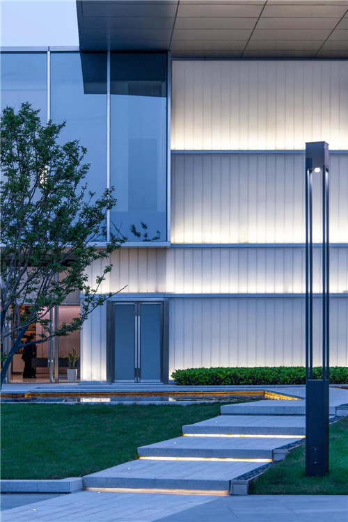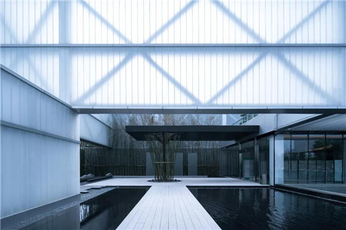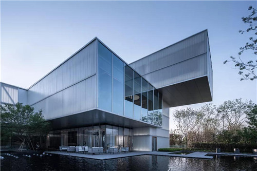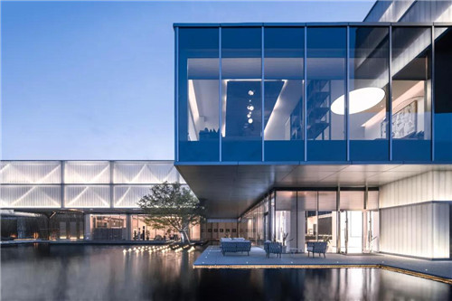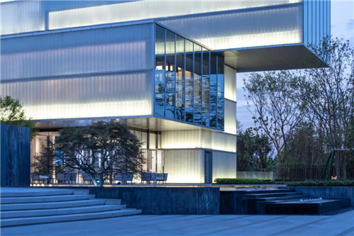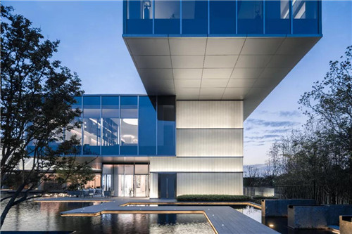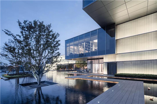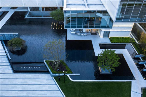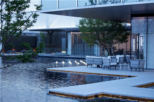 示范區整體以超大鏡面水景作為主導,結合時尚現代的建筑風格,將水的柔、靜與建筑的硬朗完美融合。“水、景、人融為一體,倒影水中映,人在畫中行。”水柔化了建筑硬朗的線條,倒影于水中,讓空間的層次更為豐富。
