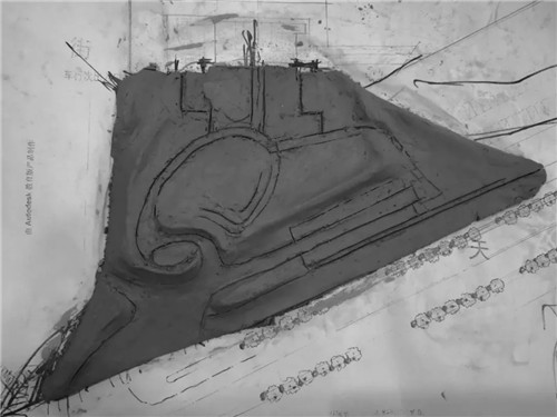 當太湖被 “引上岸”之后,我們開始試圖讓場地中出現“湖面吹來的風”、“隨風漾開的細浪“,“被細浪環繞的洲渚”……我們將這個場景意向,從腦海中移植落實在了地形塑造的過程中。廣闊平靜的湖面、起伏的草丘、懸浮的島渚,我們都通過圖紙和泥塑模擬一遍遍地推敲,每一次地形起伏的拿捏我們都異常地細致且謹慎。