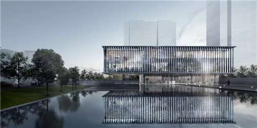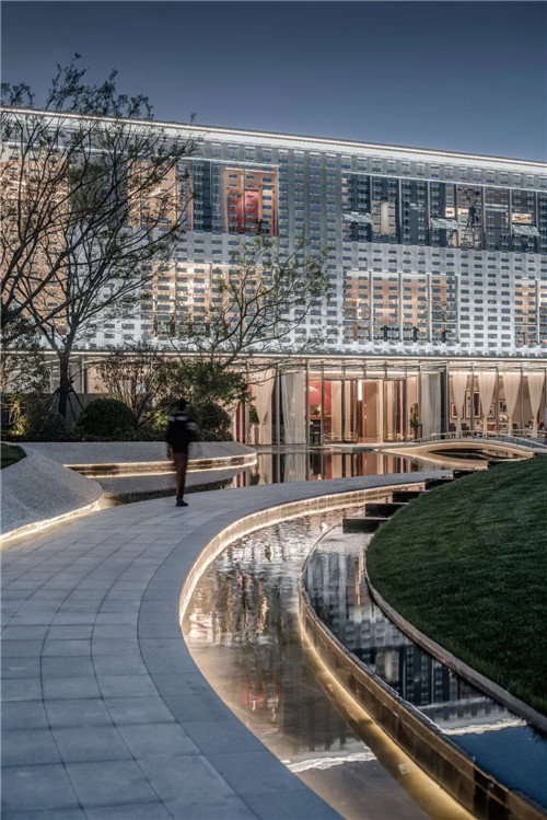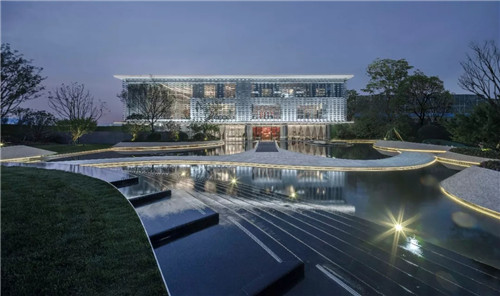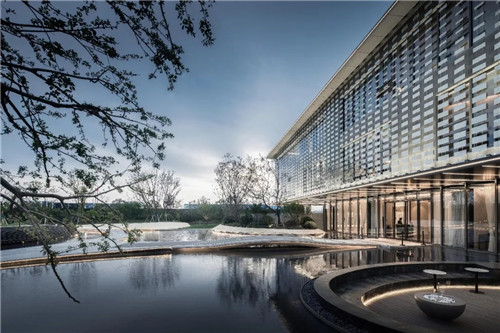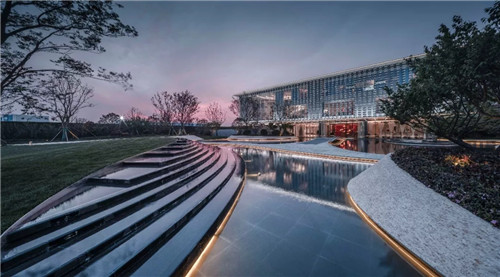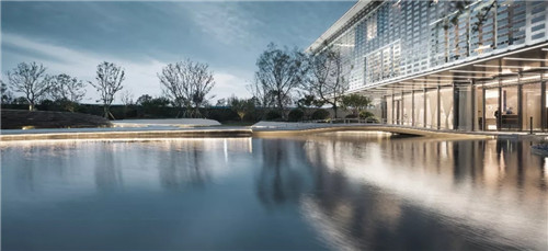 三境:水逐月影(建筑前場景觀)。“此時相望不相聞,愿逐月華流照君”。從傳統濱水而建的江南民居中獲取靈感,鏡面水景與建筑相互映襯,一汪靜水只待月影來,描繪一幅空靈、明凈的水鄉澤國意境。