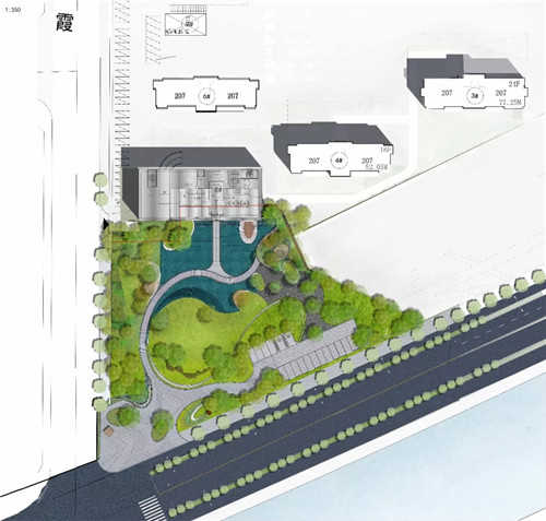項目基地距離太湖的直線距離約180米,濱水而不親水、不見水,我們從研究建筑與水面的關系入手,嘗試從空間距離與視覺效果的比例關系中尋找建場地與太湖的關系,尋找自由靈動的平面構圖方式。