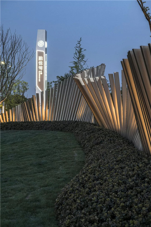 為完美展現“風行浪丘”的場景主題,羅朗資源組整合專業藝術裝置公司[MONODESIGN],運用參數化設計手段,對入口對景裝置進行了參數化設計,并采用參數化的施工方式創新地呈現了“風行浪丘”的姿態和意境。
