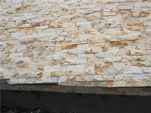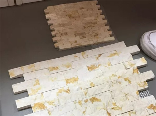 通過多次的打樣篩選,我們最終確定采用小規格,大色斑米黃色系的金碧馬賽克石材。