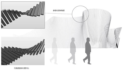 看似簡單的設計,推演過程是嚴謹而復雜的,每一根柱子的角度斜度都是經過參數計算和排布來實現不同角度的靜態變化。