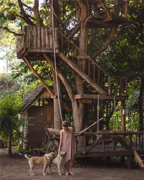 樹屋深藏林野,倚樹而建,有的還會有枝干從屋里穿過。整座房子充盈著木材、枝葉和泥土的清新淳樸的味道,人走在上面吱呀作響。外頭時不時有小鳥下來歇腳,還有蟲鳴蛙叫……光是想象,心馳神往。恨不得馬上拎包飛去。