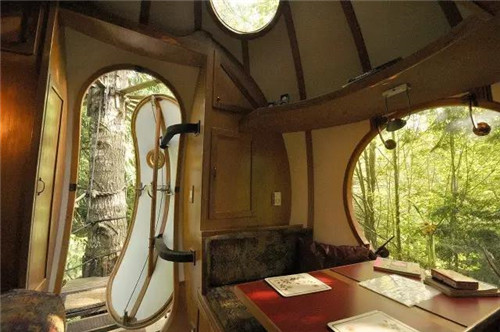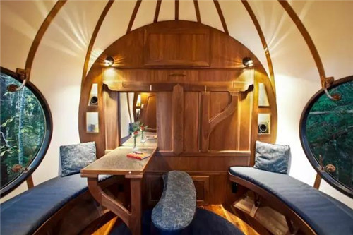 來看看樹屋內部,麻雀雖小五臟俱全,有基本的現代化設施,還會有水壺或ipod音箱等等的設備,滿足日常生活是足夠的。每一顆球體內部的裝潢都不一樣,下面這個就是Melody的內部,這里還有點小機關。現在看到的是一個客廳一樣的區域,有小桌子和沙發。