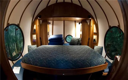 像不像在森林里“懸浮”的精靈球?而且別懷疑,這個樹屋也是用木材做的,整體由玻璃纖維和木框架制成,內外表面都有舒適的木飾面。球形造型雖然有一點限制了空間大小,但空間還是足夠的,每個球體直徑約3米,可以容納兩個人。