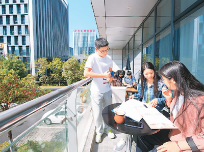 在德清地理信息小鎮,浙江國遙地理信息技術有限公司員工在茶歇時間溝通項目進度。
