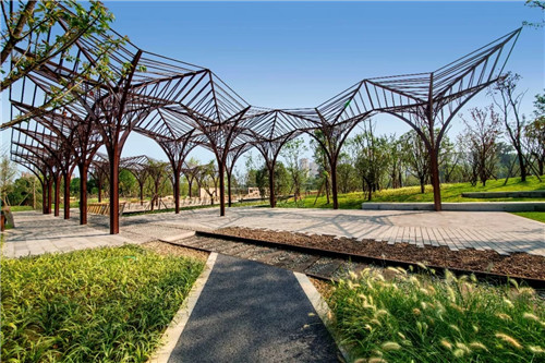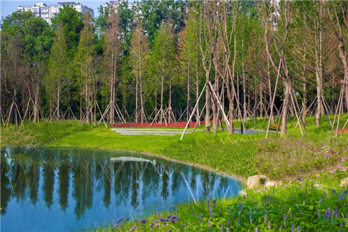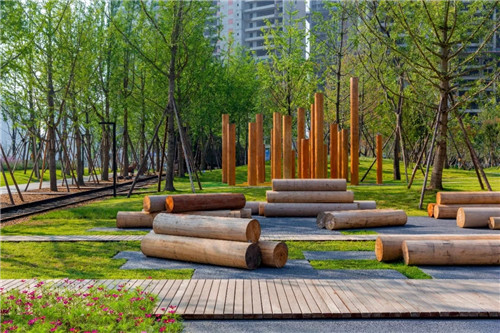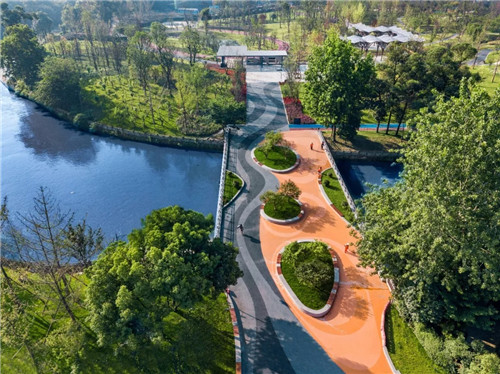 以木材文化為設計主題,尊重生態、感懷歷史,提煉出極具特色的水木華年、木排水憶、花林漫徑、云汀渡橋、水杉長堤等生活藝術場景,展現公園四季有景可賞的自然游玩性,再現場地的文化記憶,助力成都碧水長流、生機盎然的宜居濱水長廊新風貌。