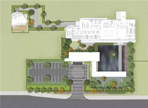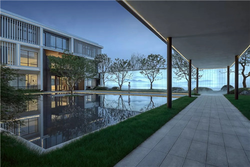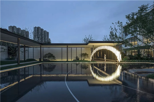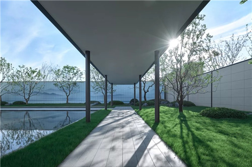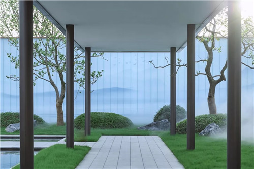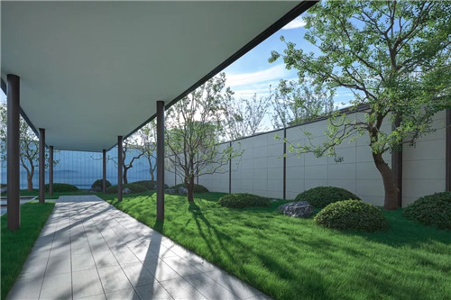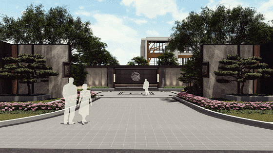 穿過大門,蒼松迎客,融合東方傳統美學,在空間上通過外部借景,輔以鋪裝設計,禮制外屏,景墻圍合限定,形成展示區前場空間,駐足青松,跌水臺階,風雨連廊,寓意豐富點綴其中,整個前場空間作為與城市的過度空間的同時致敬城市。