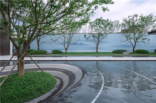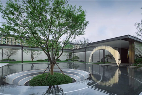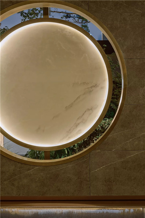 置于墻面之中的跌水臺階與月洞門,融入一份特有的東方美,于空間之中,古味和高雅油然而生,詮釋出一種靜謐的美感。