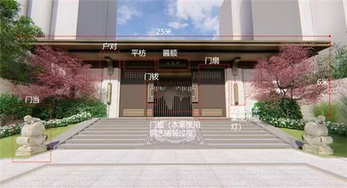 大門即為禮門,其設(shè)計遵循中國古代皇宮和府大門規(guī)制,以門頭八儀恭立府門之儀,門當(dāng)、戶對、平枋、匾額、門扇、門鈸、燈籠、門檻,細琢精雕,卓立世家風(fēng)范。從彰顯世家門第的門當(dāng),到象征身份地位的戶對;從寓意家族興旺的燈籠,到光耀世家的門楣;從大方之家的門鈸,到恢宏厚重的大門;從書有“洺悅府”的匾額,到全新設(shè)計的門檻。洺悅府大門,以門頭八儀彰顯世家氣度,傳承國戶之禮。